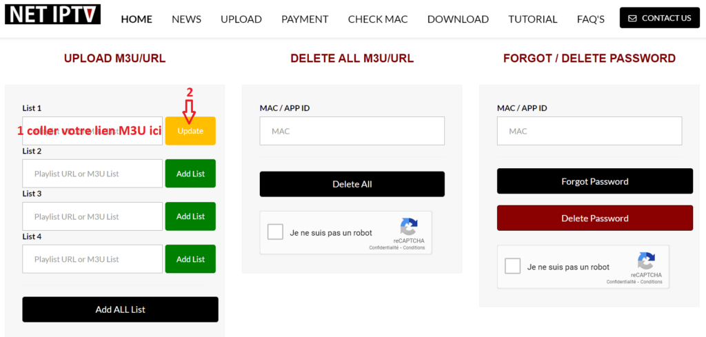 3 – En el sitio web, ingresa la dirección MAC de tu aplicación Net IPTV, completa el Captcha y luego haz clic en Agregar lista.