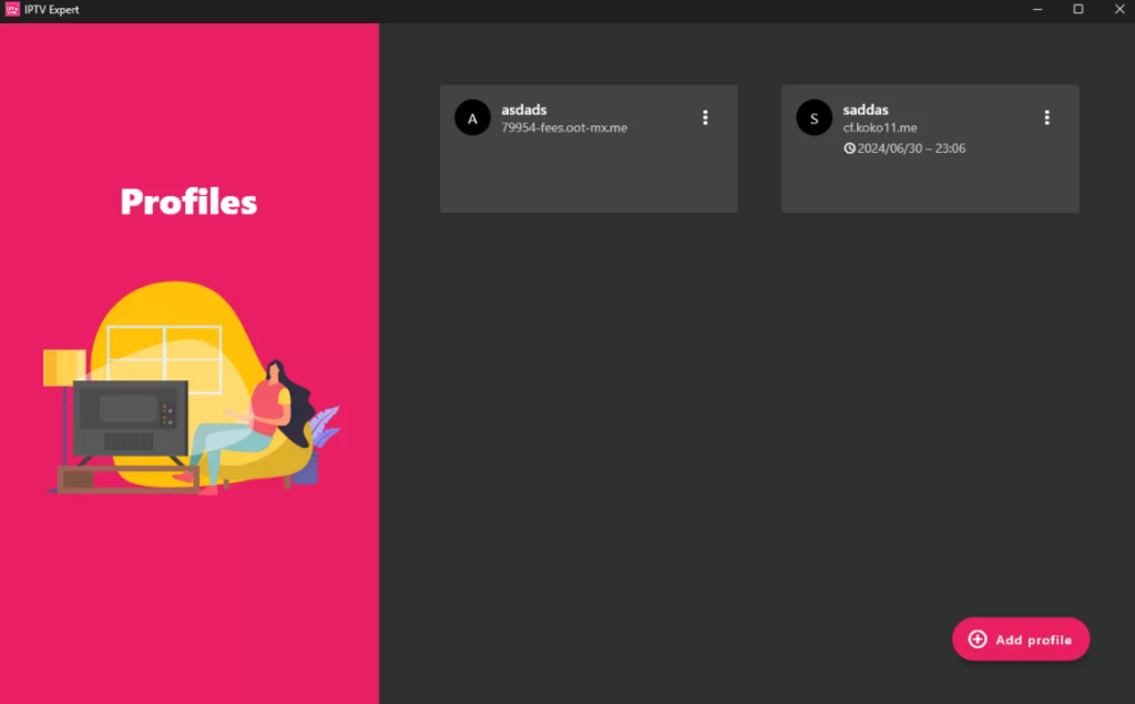 Abra Tivi Mate, el reproductor de IPTV más destacado para Windows, y seleccione “Agregar perfil”. Elija “M3U” o “Xtream Codes API” según el formato que utilice su proveedor de servicios de IPTV.